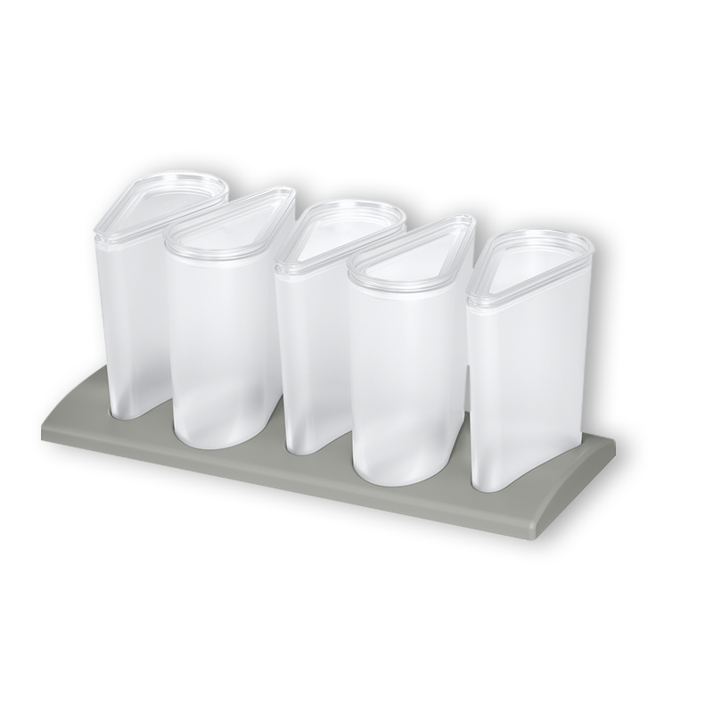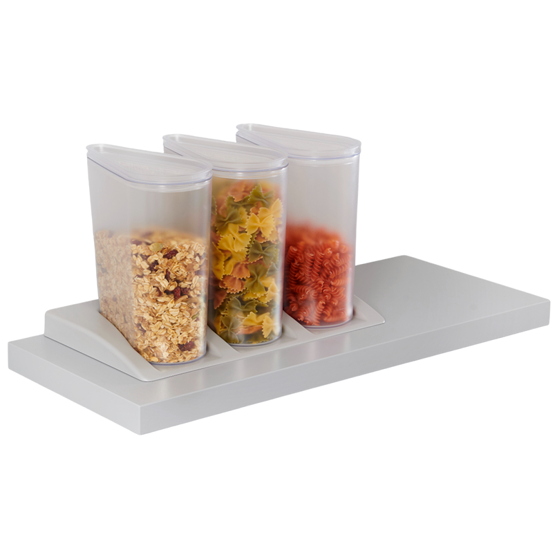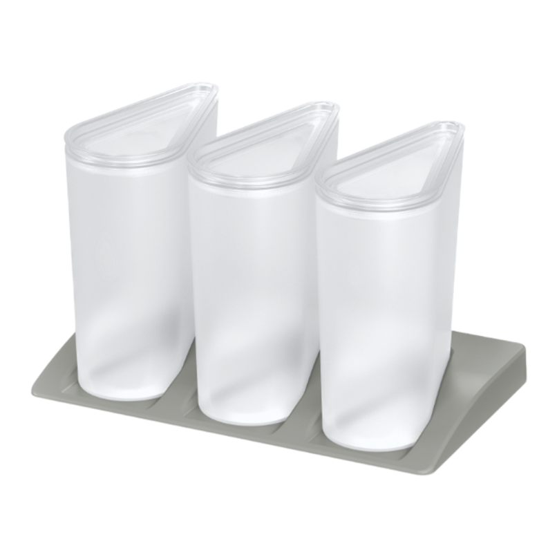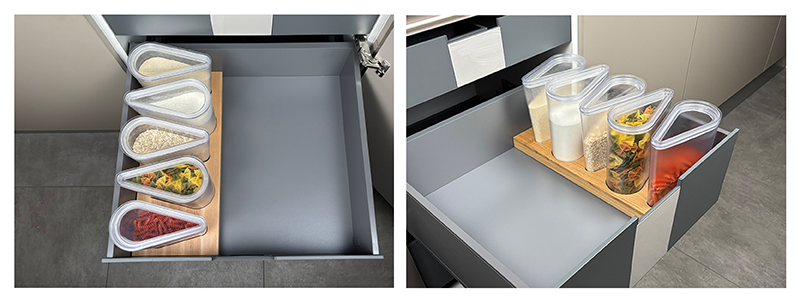 Das Vorratsdosen-Set wird mit perfekt an das jeweilige Möbelstück angepassten Matrizen geliefert. Diese sorgen für festen Stand und aufgeräumte Schränke.